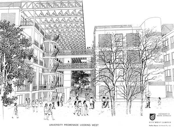 “The presence of the ‘eight lane freeway’, North Terrace, was also one of those ‘givens’ which governed the design of the City West campus from day one.