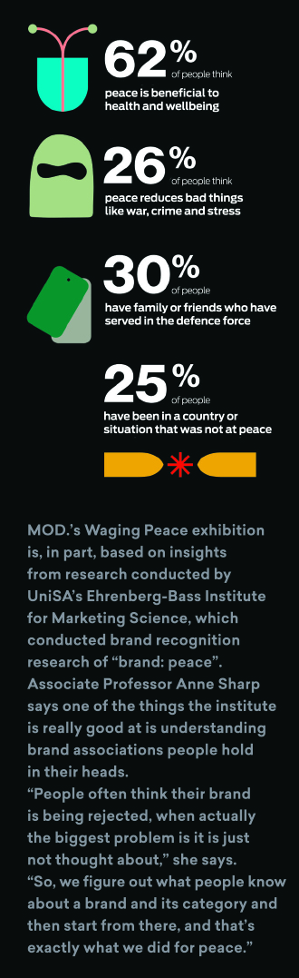 In exploring such an expansive perspective, the Waging Peace exhibition is underpinned by a detailed research project by UniSA’s Ehrenberg-Bass Institute for Marketing Science, which approached peace as if it were like any other brand, an identity that could be understood and improved. Researchers surveyed more than 400 South Australians to canvass impressions and connections that exist around peace, with some intriguing results.