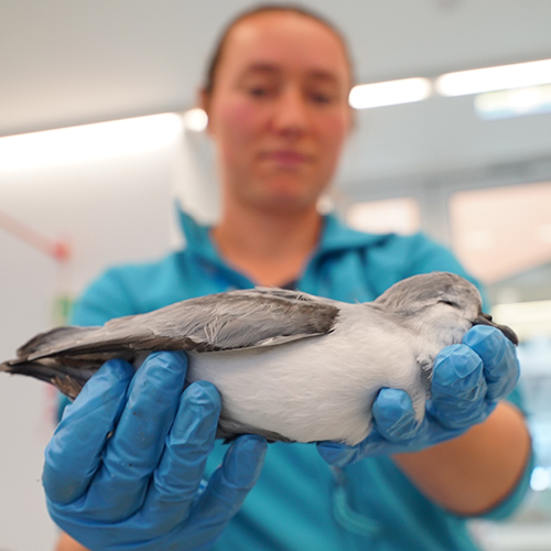Dr Lauren Roman holding a dead seabird found with plastic debris in its stomach. Photo by Lara van Raay,