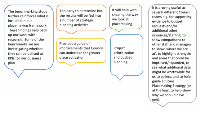 CERM PI Placemaking Benchmarks are generated based on the responses to the placemaking survey. Each year we publish a report detailing industry benchmarks across councils of varying size. You will receive a detailed analysis of how your council manages placemaking against the industry standard. The benchmarks are reported within specific categories, enabling comparison with similar types of councils. This benchmark helps identify operational areas that could benefit from improvement and make evidence-based decisions for strategic and operational planning.
